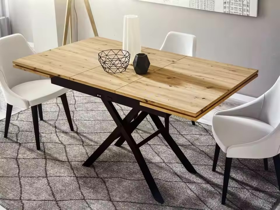 Práctica mesa de centro convertible en mesa de comedor, elevable y extensible. Eléctrica y con batería incorporada.