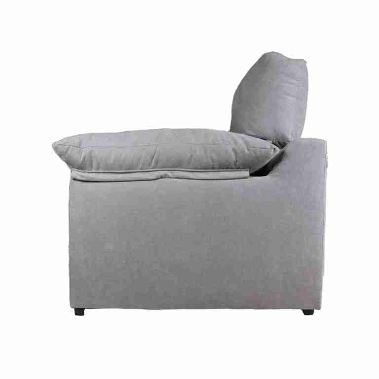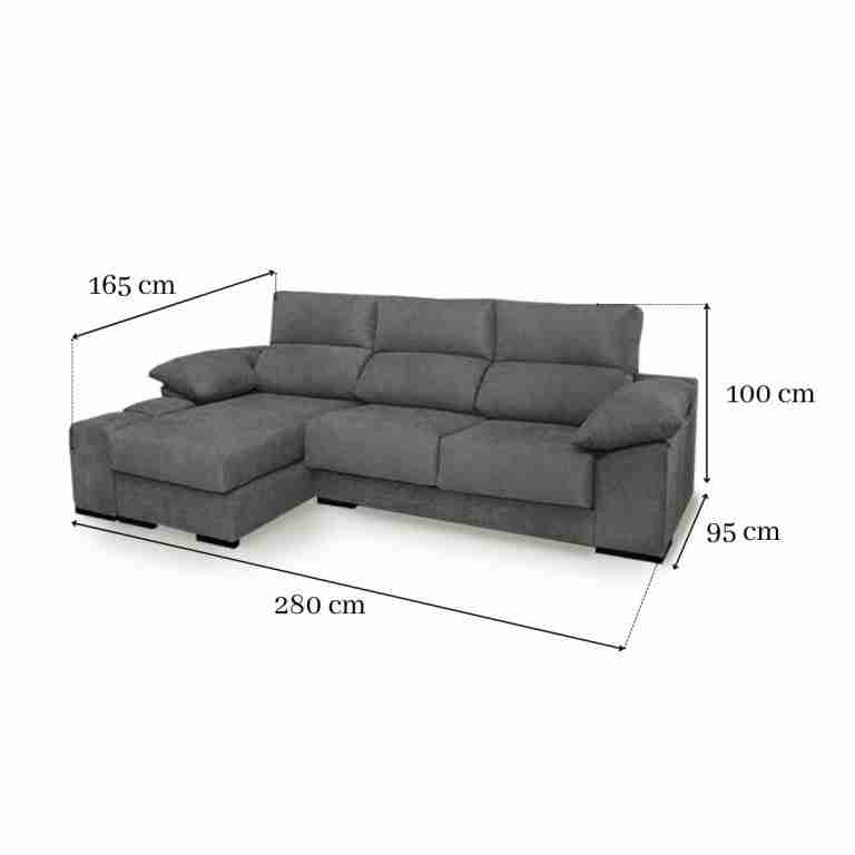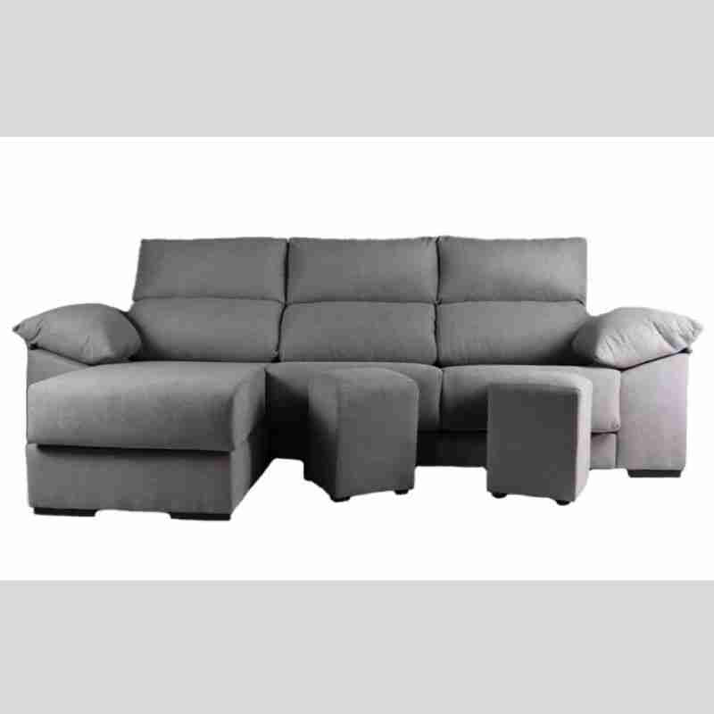 Sofá chaiselongue tapizado en tela antimanchas, disponible en frente izquierda o frente derecha (posicionándonos frente al sofá, Frente derecha llamaríamos a si el chaiselongue se encuentra a mano derecha, y Frente izquierda seria si el chaiselongue se encuentra a mano izquierda).