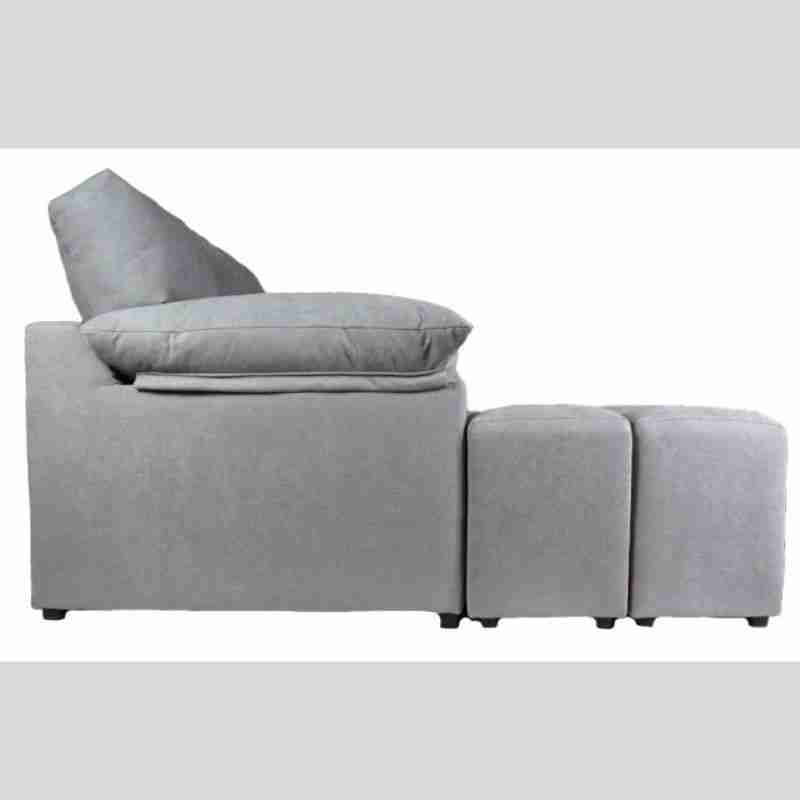 Este sofá lo complementan dos puff/taburetes que vienen de regalo y se acoplan perfectamente en el brezo del chaiselongue, tapizados también de la misma tela del sofá